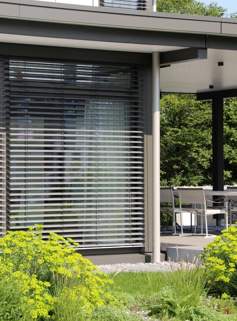 Żaluzje fasadowe, powstrzymując większość promieni słonecznych bezpośrednio wpadających do wnętrza, skutecznie zabezpieczają pomieszczenia przed nagrzaniem, ich wyposażenie przed blaknięciem oraz stwarzają korzystne warunki optyczne. Dodatkowo, swoboda regulacji kąta nachylenia listew umożliwia wybór odpowiedniego stopnia zaciemnienia.